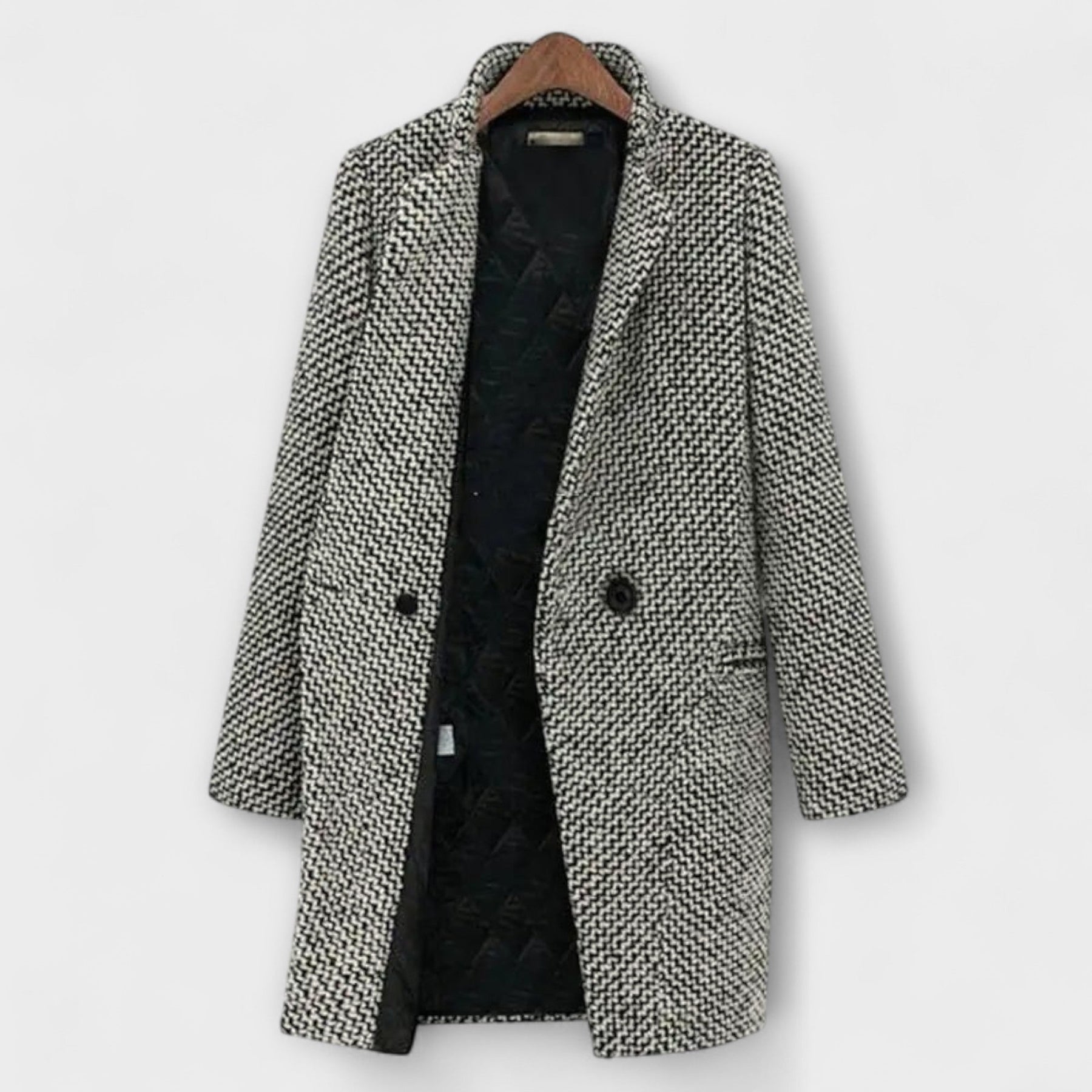 Feel wrapped in softness without the heaviness of bulky coats. This piece is crafted from a warm wool blend that keeps you cozy yet light, while the houndstooth pattern adds effortless sophistication. Its versatile cut flatters every figure, making it perfect for work meetings, evening outings, or simple city walks.